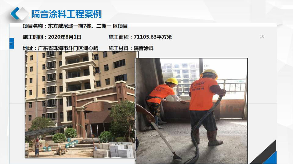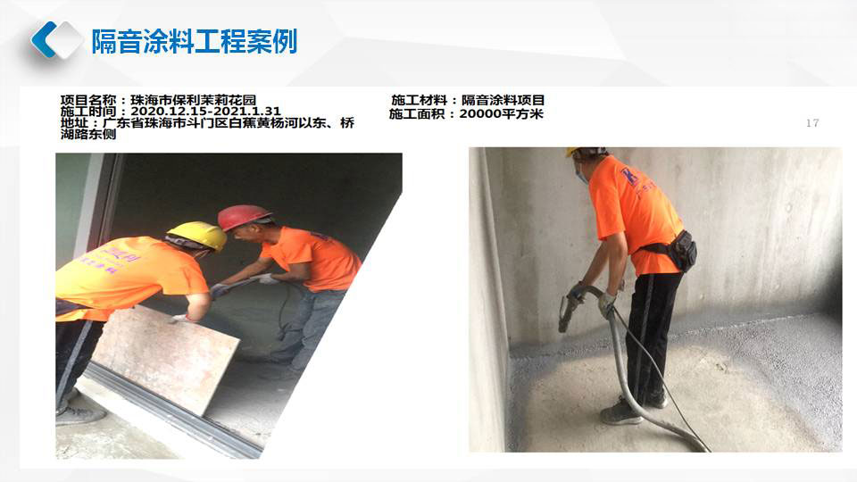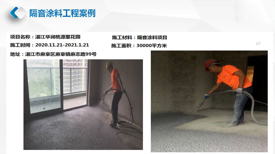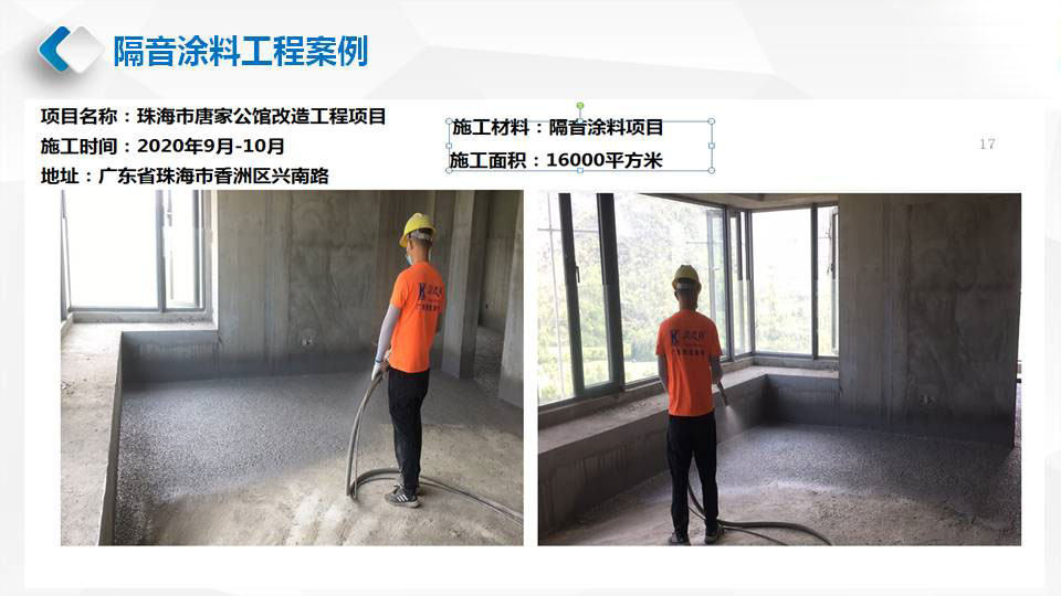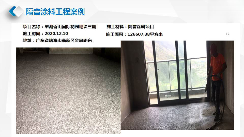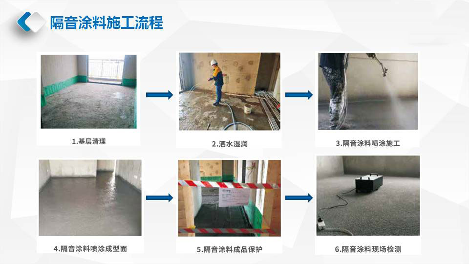 华普利隔音涂料的隔音降噪效果,在其内部降噪因子形成阻尼约束结构,当声音撞击楼板开始发出声音及振动时,楼板上的隔音阻尼涂料会在楼板上形成一种阻尼保护层增加楼板密度,有效将声波的机械能转化成热能耗散掉,从而显著提高楼板的隔音效果。