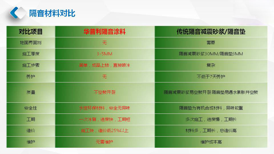 华普利隔音涂料是一款绿色节能,减音降噪的隔音产品。拥有独家核心技术,由新型的高性能阻尼防腐材料、隔音棉、3M玻璃微珠、阻燃剂、防水乳液、补强材料等以及相关水性助剂配制而成。可用于楼板水泥基面,复合材料的表面。该产品A2级防火、耐水防潮、耐候性能好,附着力强,无空鼓、防开裂、水性环保,隔音降噪系数接近隔音垫(同厚度)的效果,可满足隔音、保温的要求。